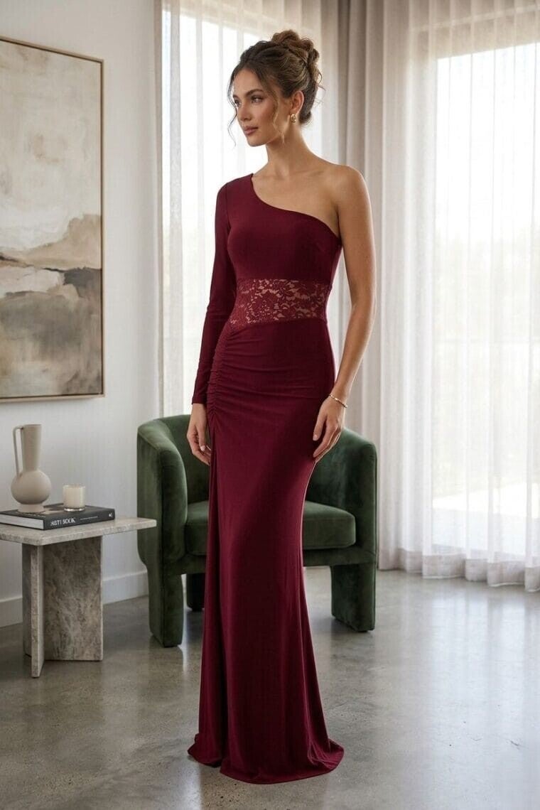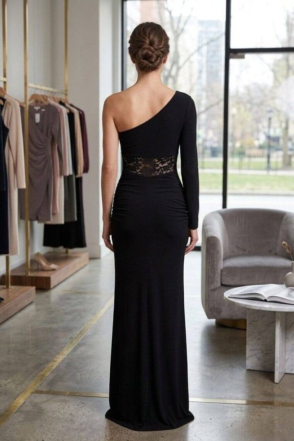 A sleek one-shoulder maxi dress with a lace waist detail for a bold yet elegant statement look.