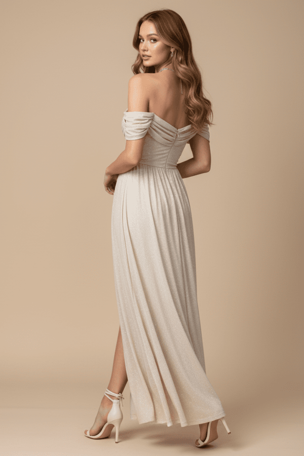 - Elegant off-shoulder neckline with draped sleeve detail