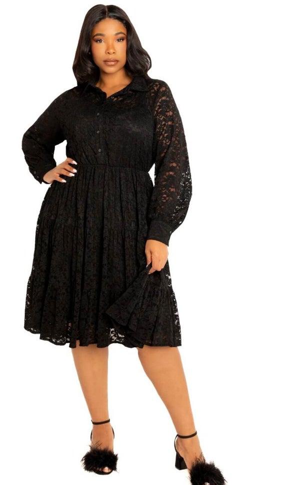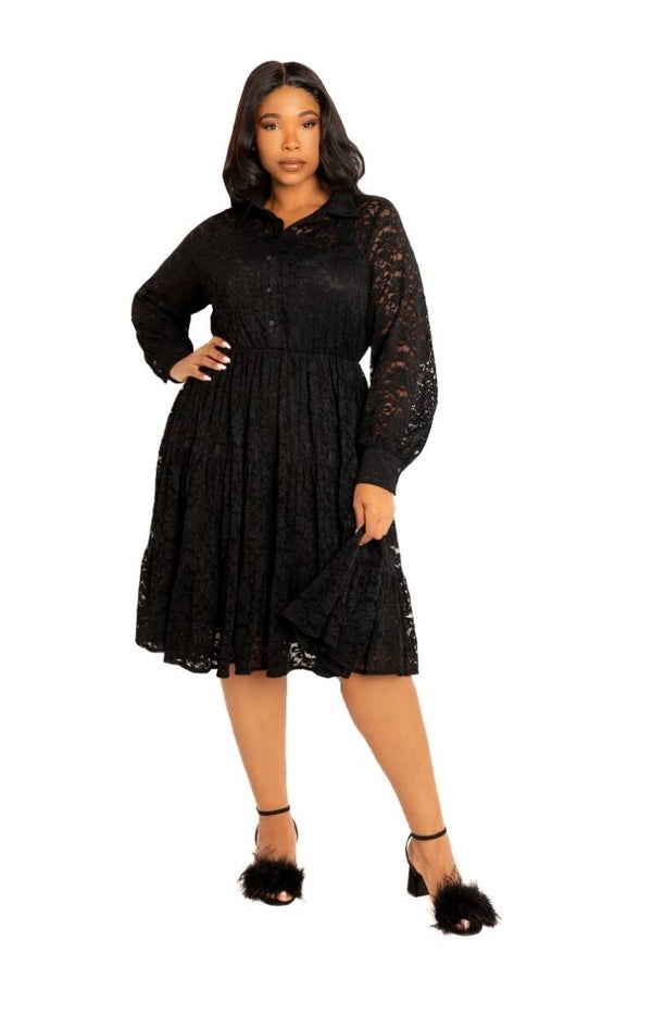 - Intricate Lace: The entire dress is crafted from lovely floral lace, featuring a semisheer bodice and long sleeves with button cuffs.